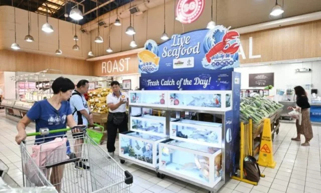 Los clientes de tres sucursales de supermercados gigantes ahora pueden comprar mariscos vivos en Singapur, incluidos peces tilapia, camarones, mero y camarones vannamei (camarones blancos).